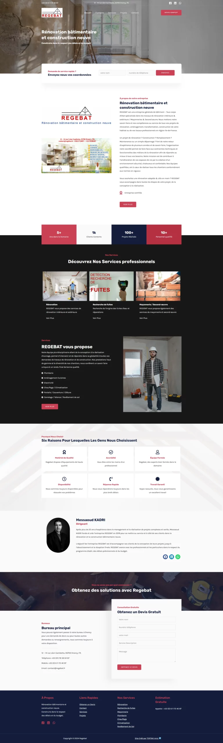 Le site vise à présenter les services de Regebat, une entreprise spécialisée dans les travaux de construction et de rénovation pour les particuliers et les professionnels.